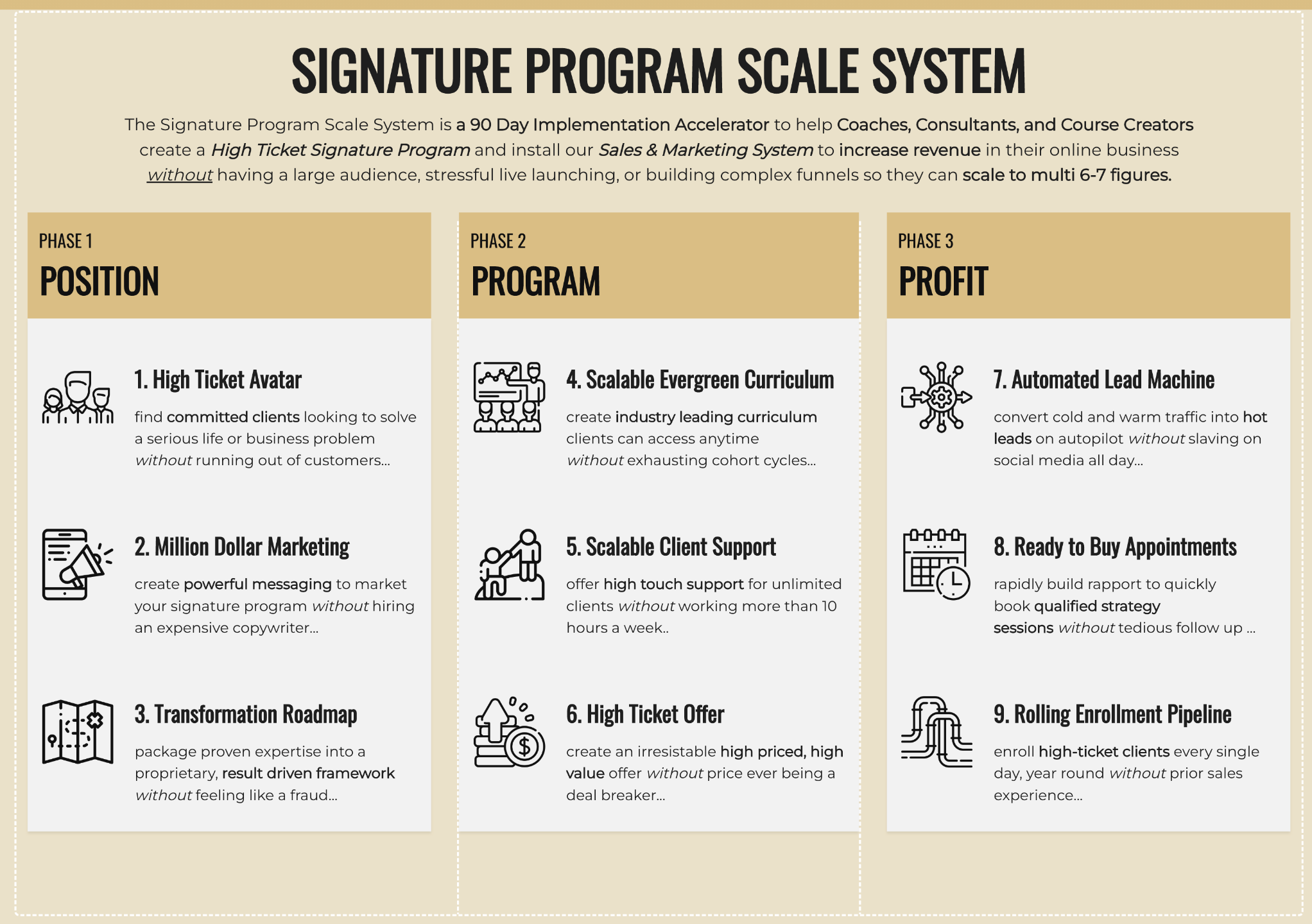 I help online business owners install my proprietary Signature Program Scale System in their business so they can finally obtain the financial and lifestyle freedom they desire.